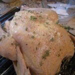Brush melted butter over the entire chicken. If you prefer you can brush with olive oil. Season liberally with kosher salt and freshly ground black pepper, inside and outside, and sprinkle with some fresh thyme.  Stuff the cavity with a whole lemon, cut in half, a few sprigs of fresh thyme and fresh rosemary.